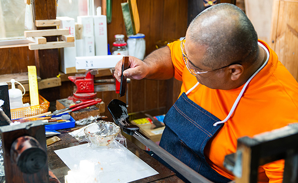 沖縄の三線店で、本漆の髹漆(「きゅうしつ」漆を塗ること)、加飾ができる三線職人は「運天 伊作」のみです。